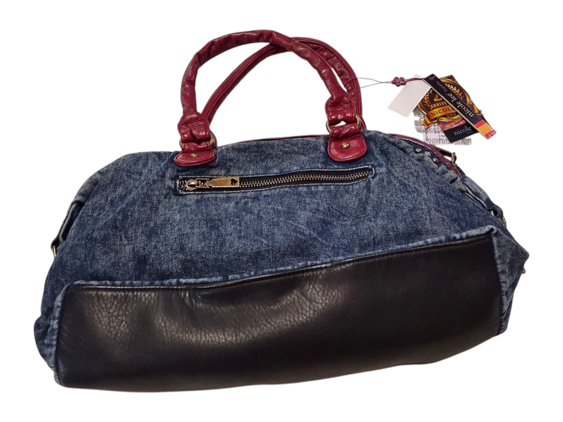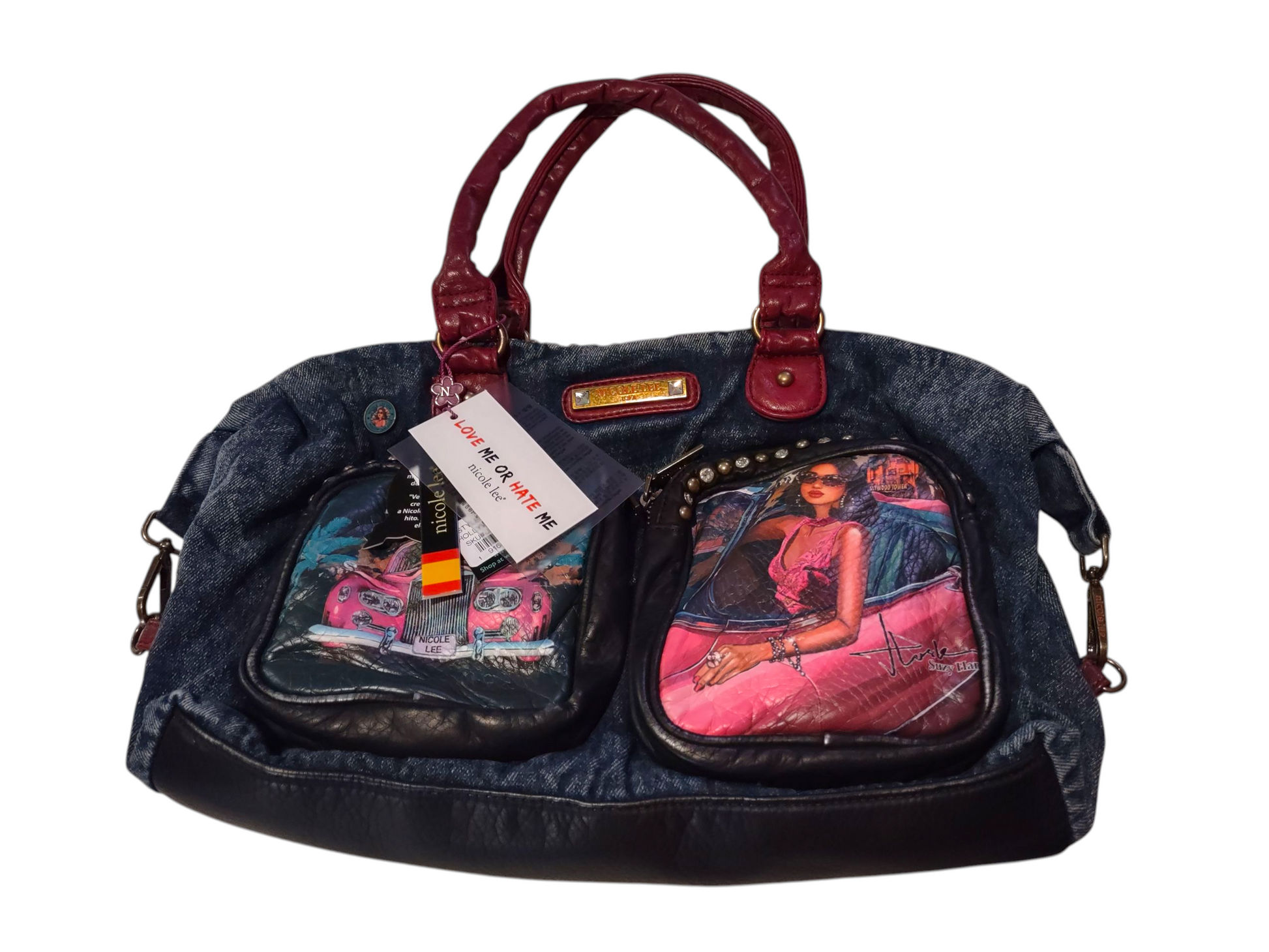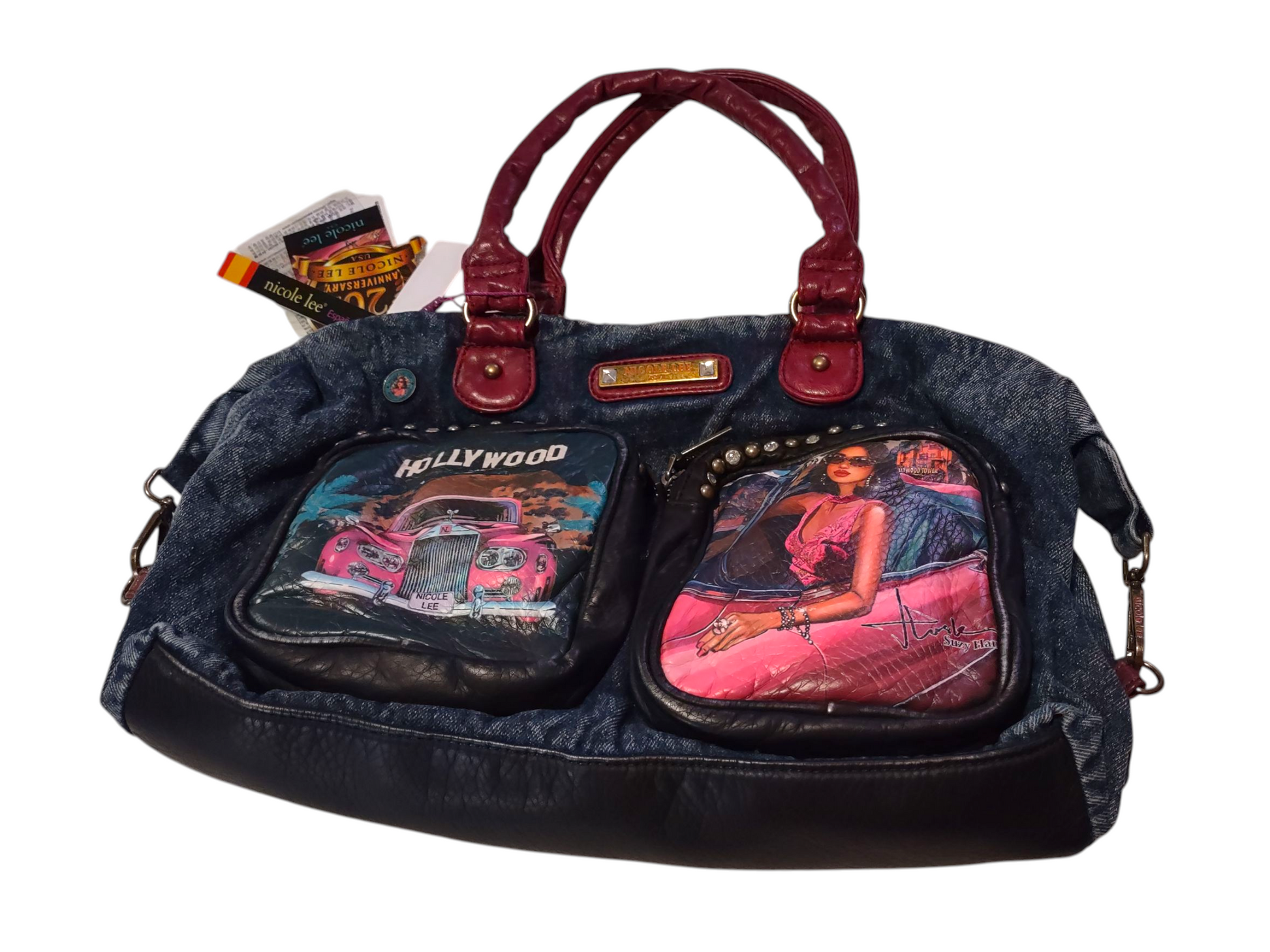 NICOLE LEE HOLLYWOOD DRIVE WASHED DENIM HANDBAG Product Details Washed denim cotton exterior with vegan leather accents Soft, relaxed silhouette Structured, rolled dual top handles (7.5" drop) with Nicole Lee authentic circle charm Extended zip top closure with snap hook ends Studded with brass-tone studs and diamond rhinestones 2 front zip compartments Side D-ring buckles Back zip pocket Brass tone-hardware Logo engraved nameplate with diamond rhinestones Heart zipper pulls Interior premium print lining in polyester Back interior zip pocket with logo nameplate and key ring strap 2 front interior slip pockets for smartphone and wallet storage Includes adjustable, detachable crossbody strap Size: 13"L x 5"W x 9.5"H