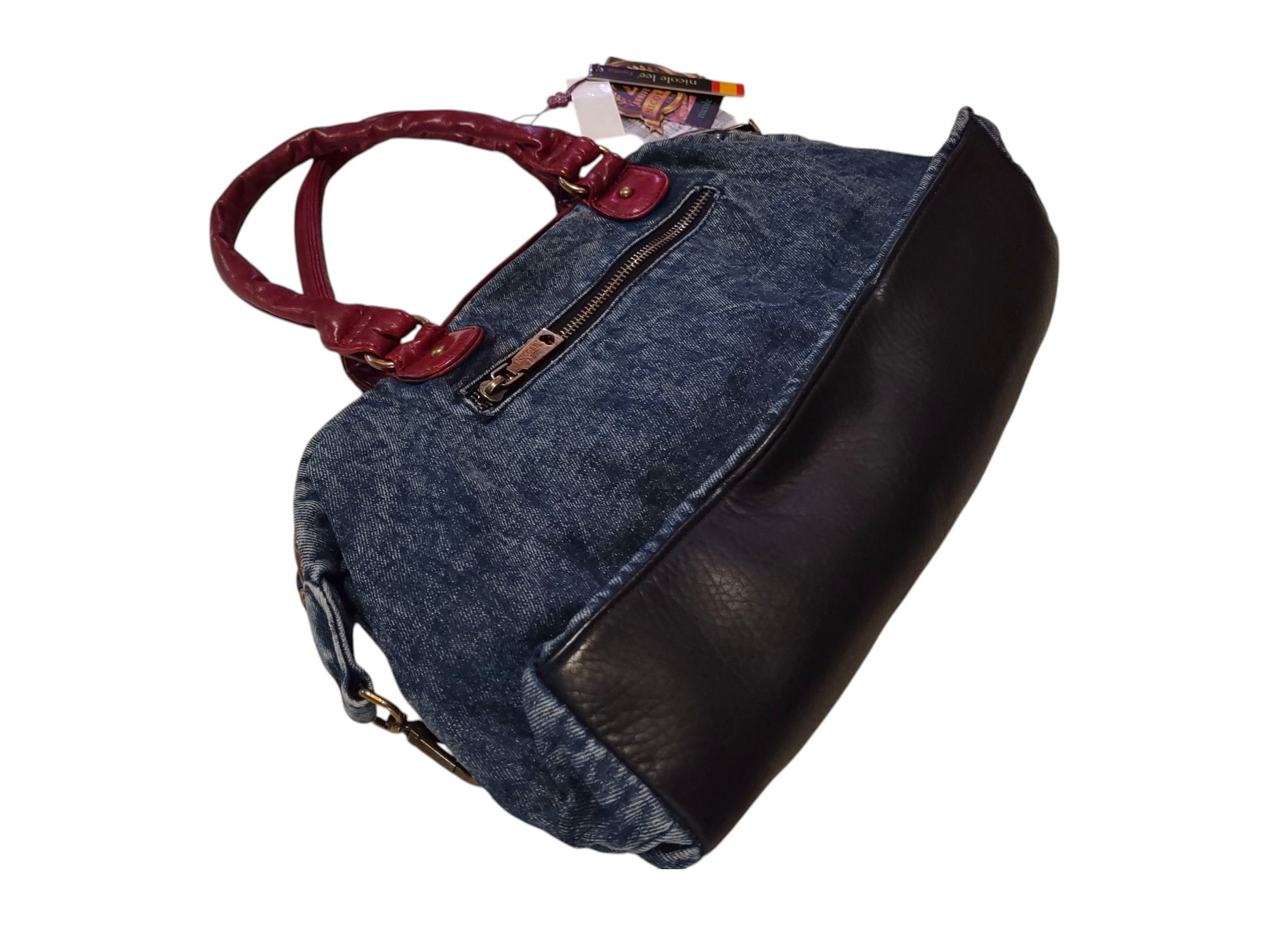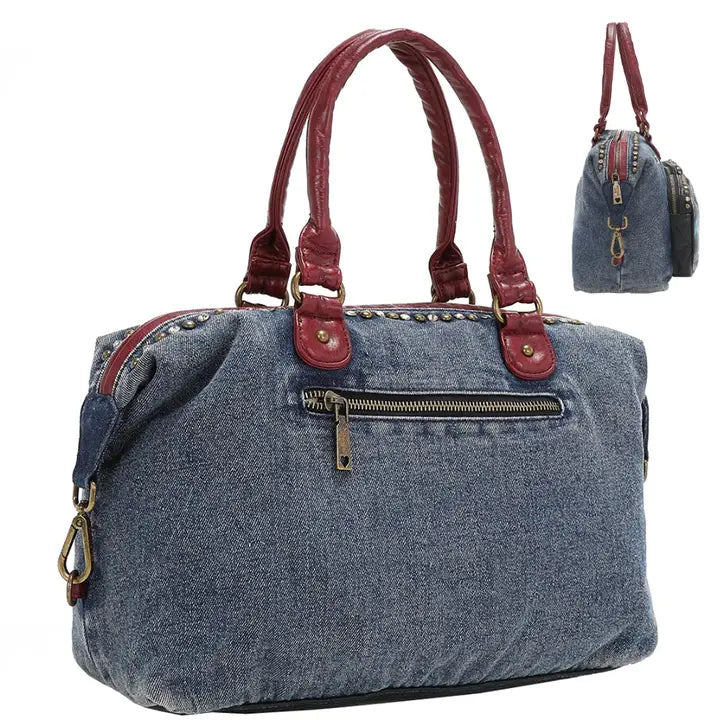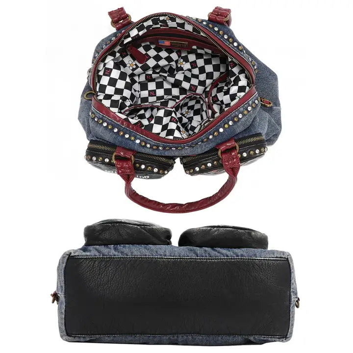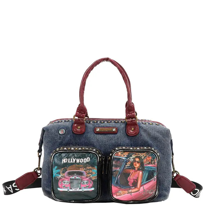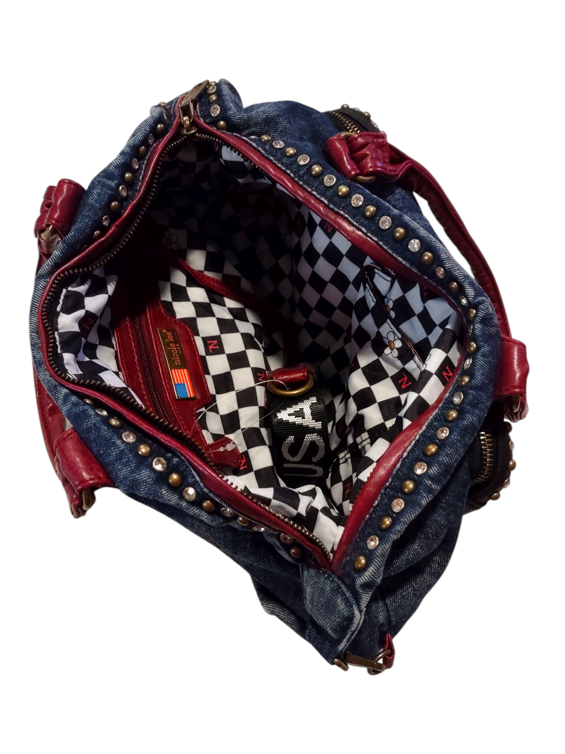 NICOLE LEE HOLLYWOOD DRIVE WASHED DENIM HANDBAG Product Details Washed denim cotton exterior with vegan leather accents Soft, relaxed silhouette Structured, rolled dual top handles (7.5" drop) with Nicole Lee authentic circle charm Extended zip top closure with snap hook ends Studded with brass-tone studs and diamond rhinestones 2 front zip compartments Side D-ring buckles Back zip pocket Brass tone-hardware Logo engraved nameplate with diamond rhinestones Heart zipper pulls Interior premium print lining in polyester Back interior zip pocket with logo nameplate and key ring strap 2 front interior slip pockets for smartphone and wallet storage Includes adjustable, detachable crossbody strap Size: 13"L x 5"W x 9.5"H