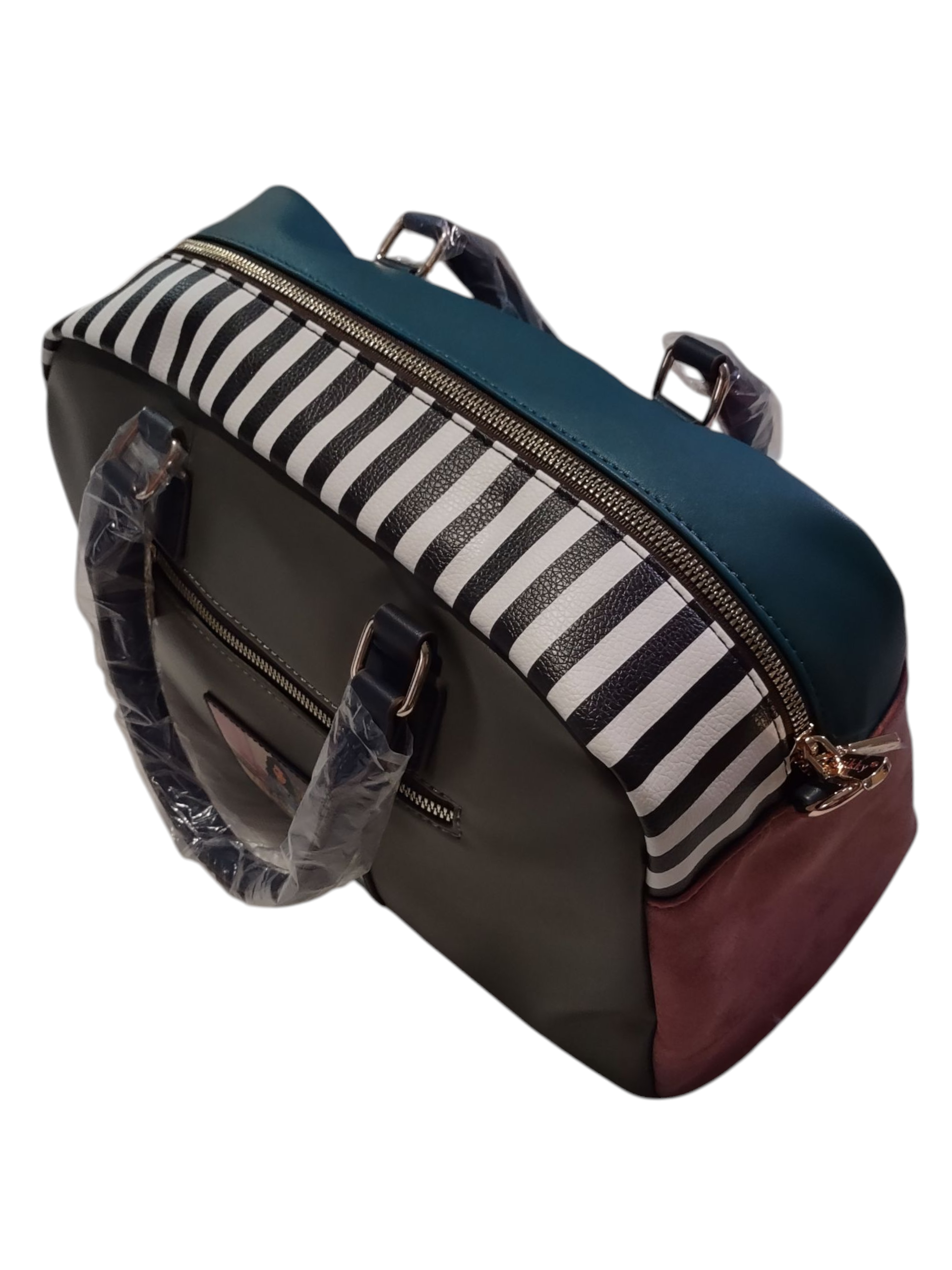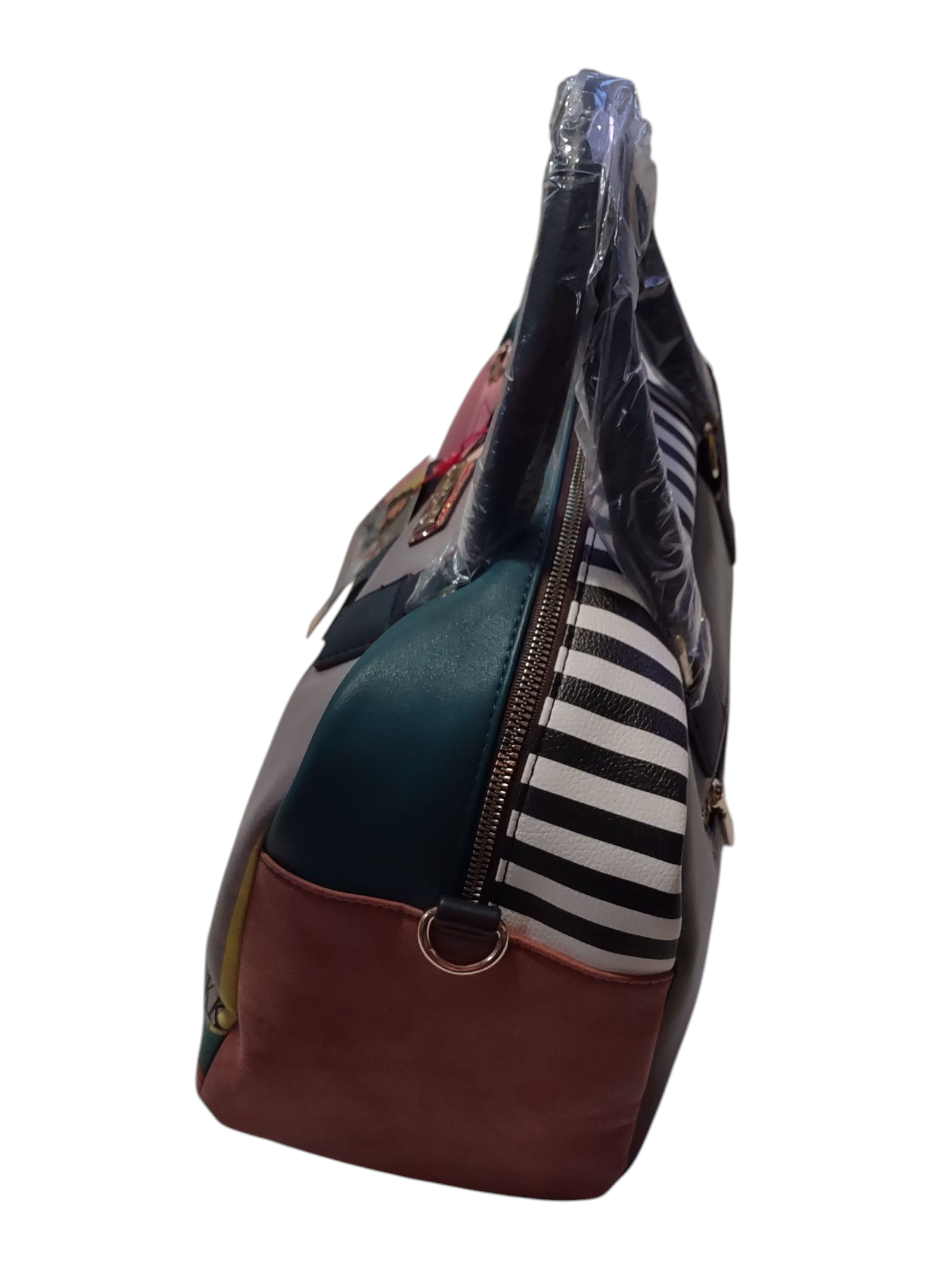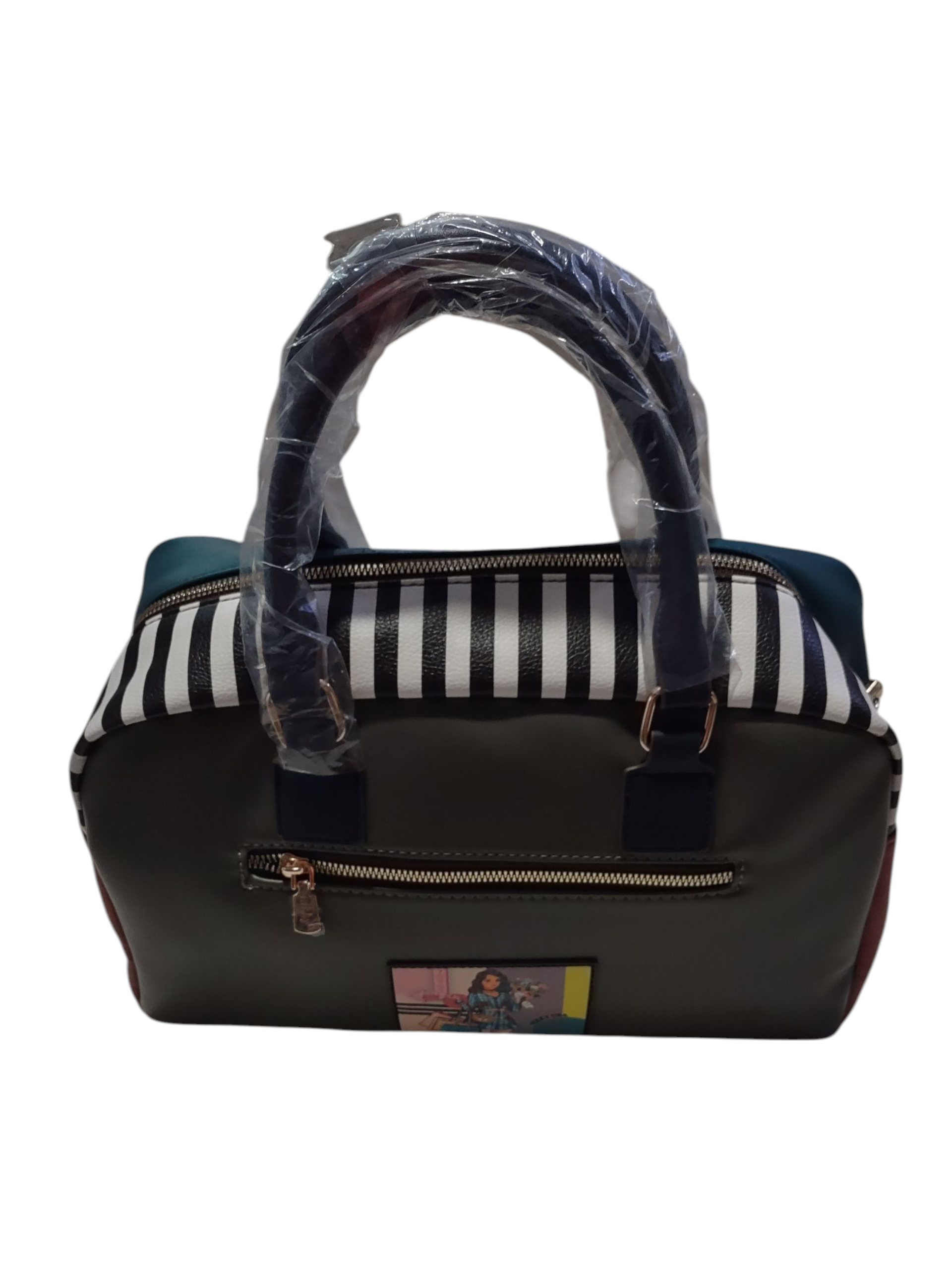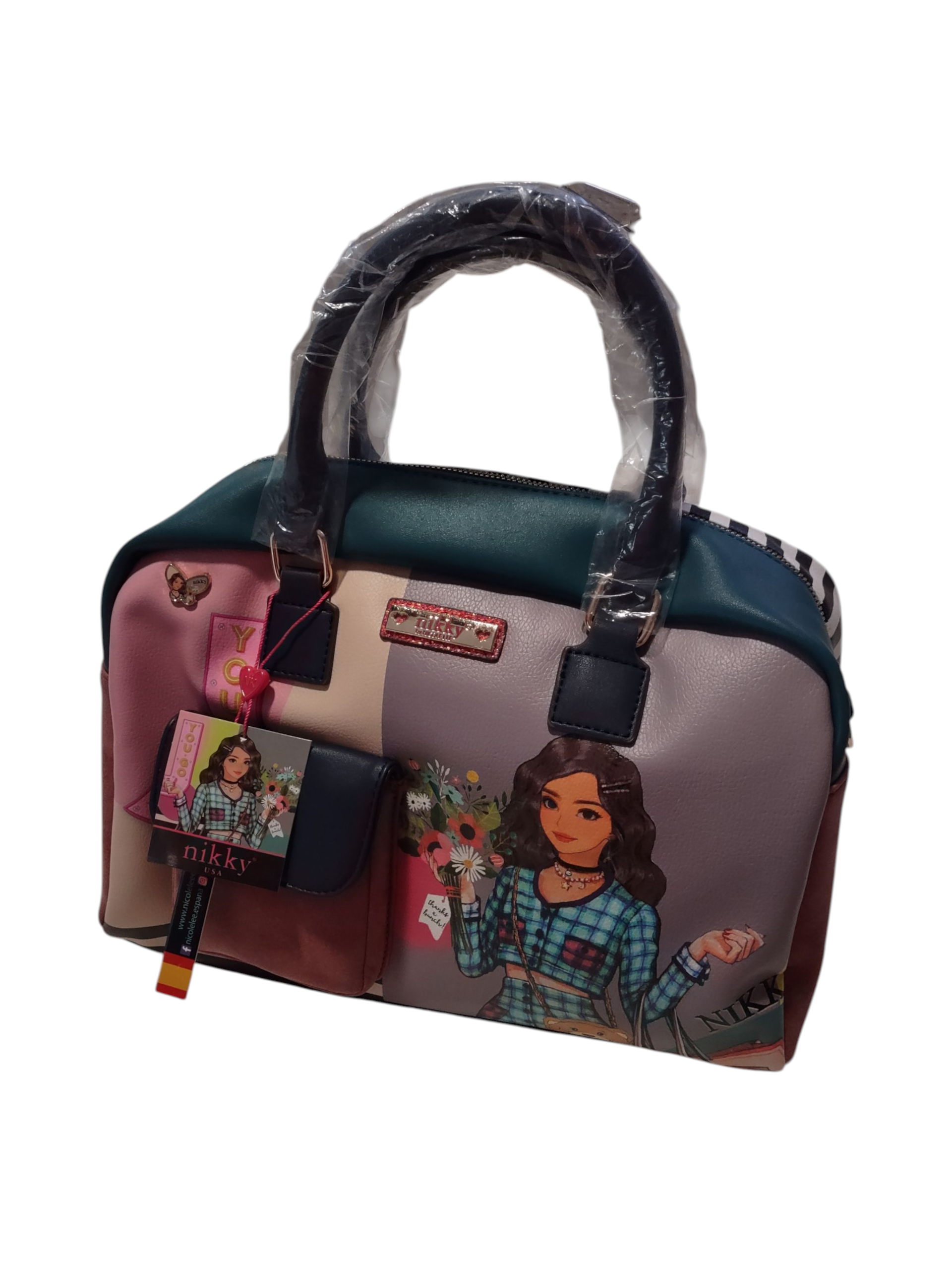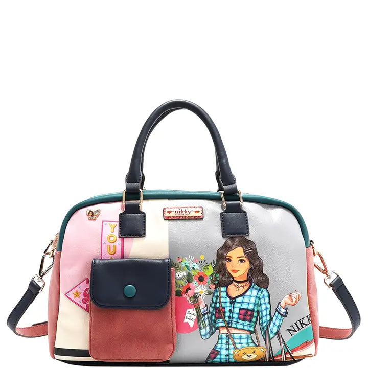 NIKKY BY NICOLE LEE BOSTON BAG Product Details: Made of high-quality smooth eco-leather and PU suede. Dual 6” drop rolled top eco-leather handles. Main zipper closure with Nikky Logo zipper pulls. Exclusive Nikky Signature "Nikky Goes Shopping" print at front. Front Magnetic snap closure pocket. Nikky gold-toned logo nameplate at front. Back zipper wall pocket with Nikky Logo engraved zipper pulls. Gold-toned D-rings on sides for shoulder strap. Structured Silhouette with flat base. Removable and adjustable 27" - 45" pu strap. Lined with Nikky signature print nylon fabric. Two interior open wall accessory pockets at front. One interior zip wall pocket at back with eco-leather key chain clasp. Size: 8.5" H X 14" L X 6.5" W Weight: 3lbs for cleaning, wipe with damp cloth.