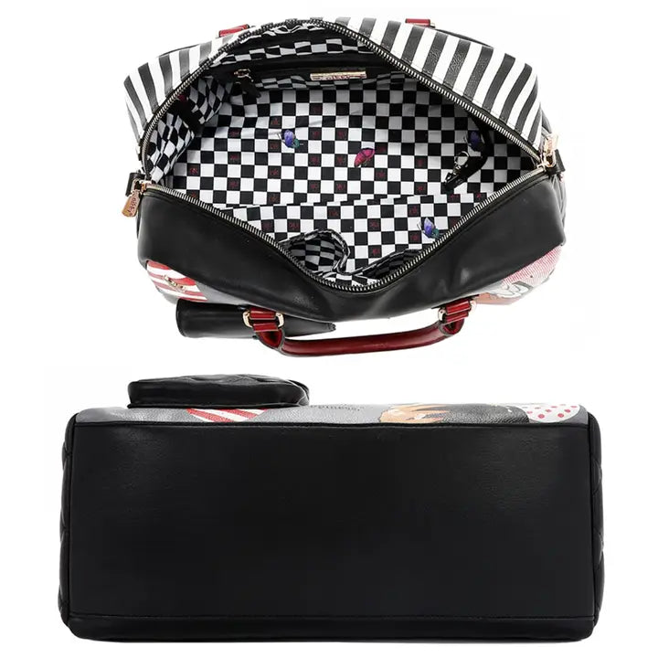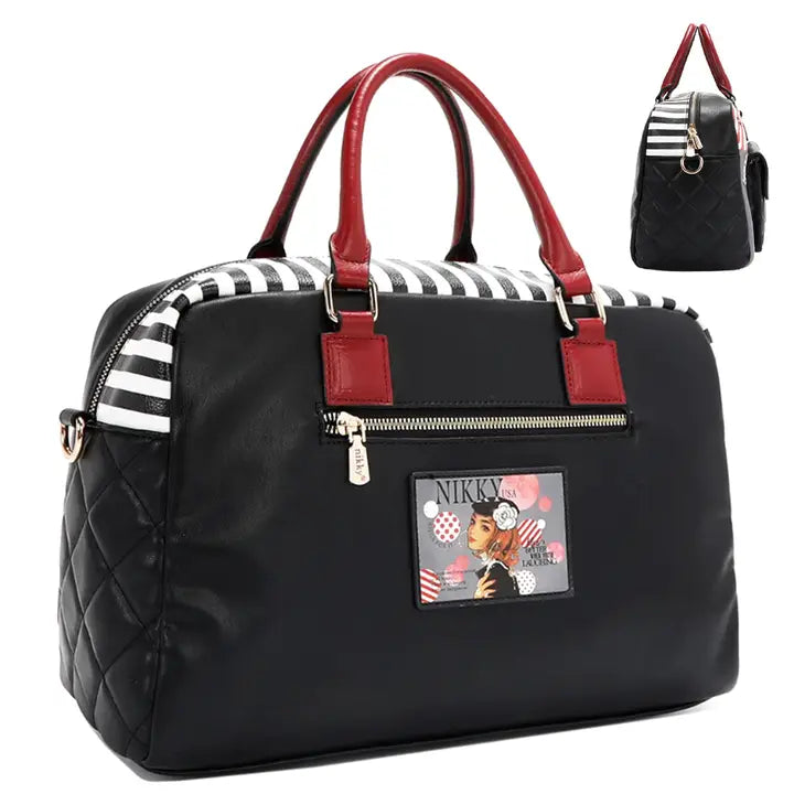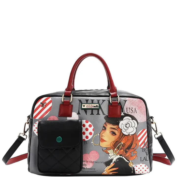 NIKKY BY NICOLE LEE BOSTON BAG Product Details: Made of high-quality smooth eco-leather and PU suede. Dual 6” drop rolled top eco-leather handles. Main zipper closure with Nikky Logo zipper pulls. Exclusive Nikky Signature "Nikky Goes Shopping" print at front. Front Magnetic snap closure pocket. Nikky gold-toned logo nameplate at front. Back zipper wall pocket with Nikky Logo engraved zipper pulls. Gold-toned D-rings on sides for shoulder strap. Structured Silhouette with flat base. Removable and adjustable 27" - 45" PU strap. Lined with Nikky signature print nylon fabric. Two interior open wall accessory pockets at front. One interior zip wall pocket at back with eco-leather key chain clasp. Size: 8.5" H X 14" L X 6.5" W Weight: 3lbs for cleaning, wipe with damp cloth.