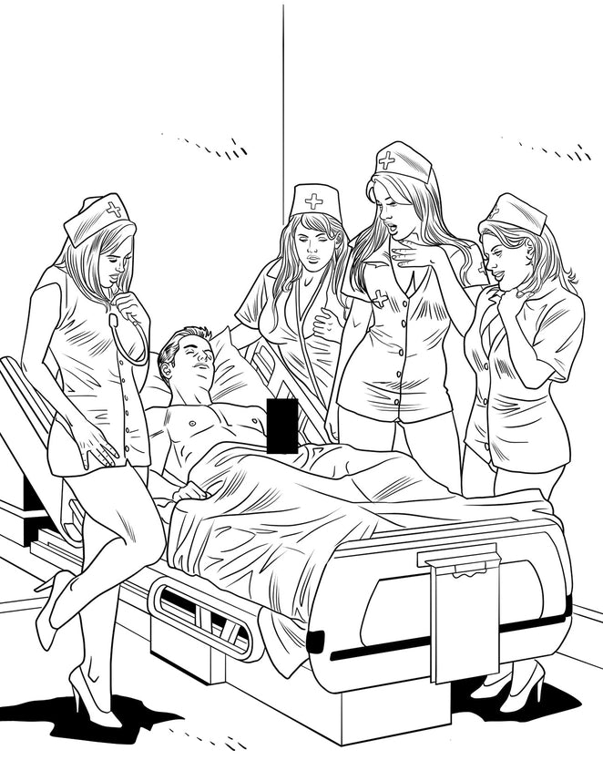 Feel your temperature rise with the XXX Nurses Adult Coloring Book! Featuring 24 pages with original illustrations of your favorite candy stripers doing anything and everything to help their patients feel better, and the only cure is coloring! The illustrations contain nudity and are for Adults Only. Color it in with crayons or colored pencils or markers or give it as a gift. You don't even need to be sick to enjoy it! Contains explicit hardcore imagery.